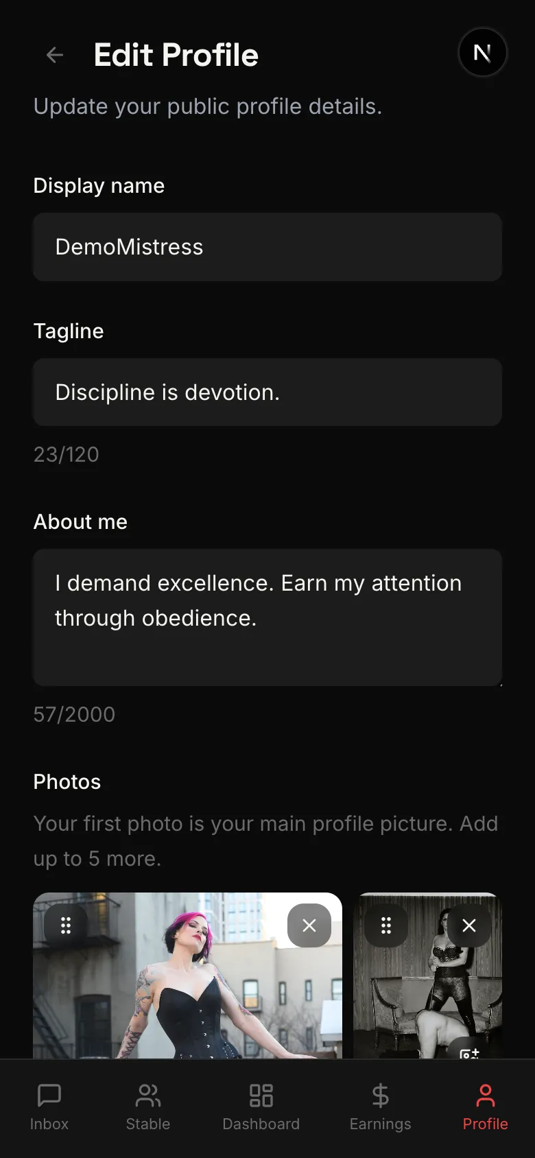 Your profile is the first thing other users see. A complete, well-crafted profile significantly increases engagement — whether you're a Mistress looking to attract devoted slaves or a slave looking to connect with the right Mistress.